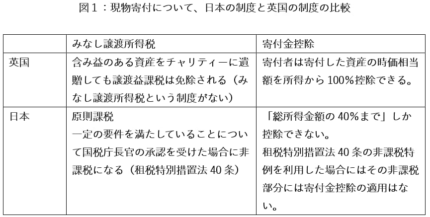 諸外国を見ると、そもそもみなし譲渡所得税の制度が存在する国は多くありません。さらに、多くの国では、みなし譲渡所得税の課税がないうえに、その資産の時価相当額について寄付金控除が認められています(例えば、第10回 「4. 現物資産寄付の優遇 ― キャピタルゲイン非課税+所得控除100%」参照)。こうした状況と比較すると、日本との制度差は非常に大きいといえます。