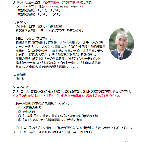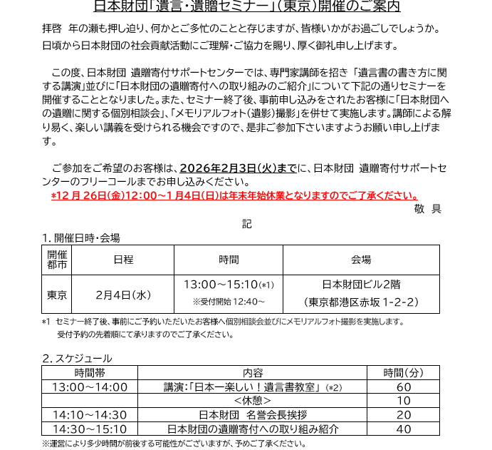 2026年2月「遺言・遺贈セミナー」(東京)を開催します。