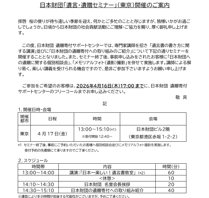 2026年4月「遺言・遺贈セミナー」(東京)を開催します。